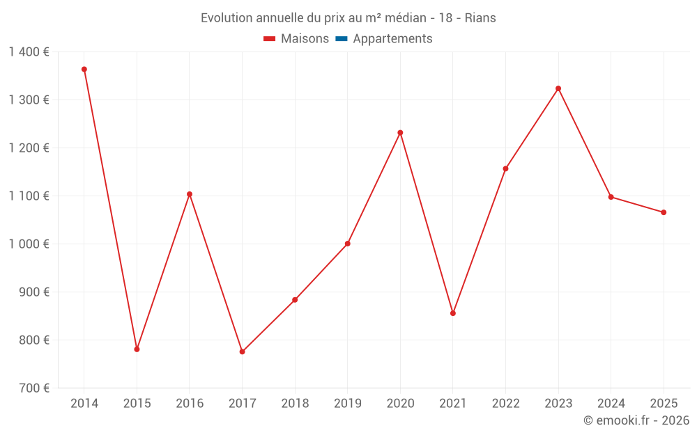 Le prix médian sur les 14 transactions de maisons des 24 derniers mois dans la commune de Rians était de 1 098 € par mètre carré pour une valeur foncière médiane de 77 000 €. Sur cette période 60% des transactions se sont situées entre 882 et 1 318 € par mètre carré (du 2ème au 8ème déciles).