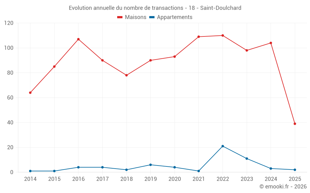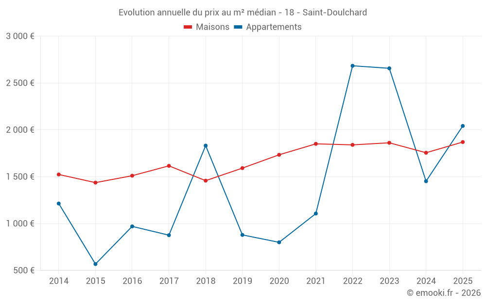 Le prix médian sur les 39 transactions de maisons des 6 derniers mois dans la commune de Saint-Doulchard était de 1 870 € par mètre carré pour une valeur foncière médiane de 149 000 €. Sur cette période 60% des transactions se sont situées entre 1 256 et 2 270 € par mètre carré (du 2ème au 8ème déciles).