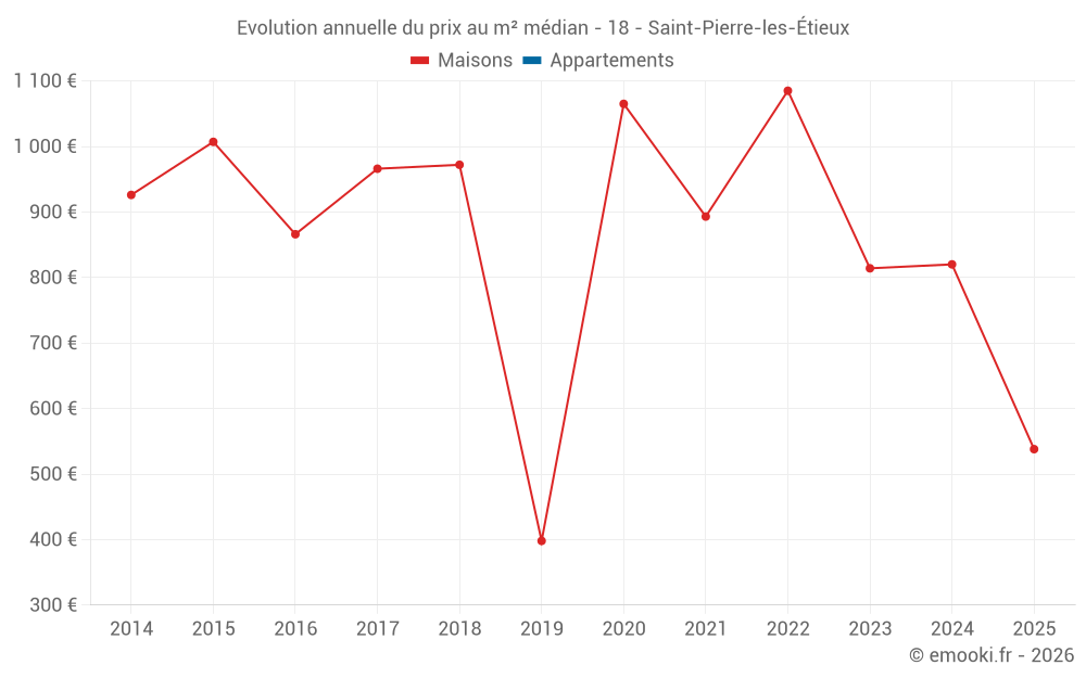 Le prix médian sur les 17 transactions de maisons des 24 derniers mois dans la commune de Saint-Pierre-les-Étieux était de 852 € par mètre carré pour une valeur foncière médiane de 82 000 €. Sur cette période 60% des transactions se sont situées entre 580 et 1 082 € par mètre carré (du 2ème au 8ème déciles).