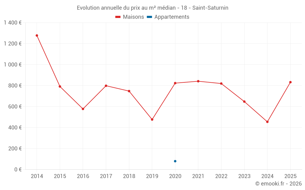 Le prix médian sur les 29 transactions de maisons des 24 derniers mois dans la commune de Saint-Saturnin était de 763 € par mètre carré pour une valeur foncière médiane de 50 000 €. Sur cette période 60% des transactions se sont situées entre 341 et 1 216 € par mètre carré (du 2ème au 8ème déciles).