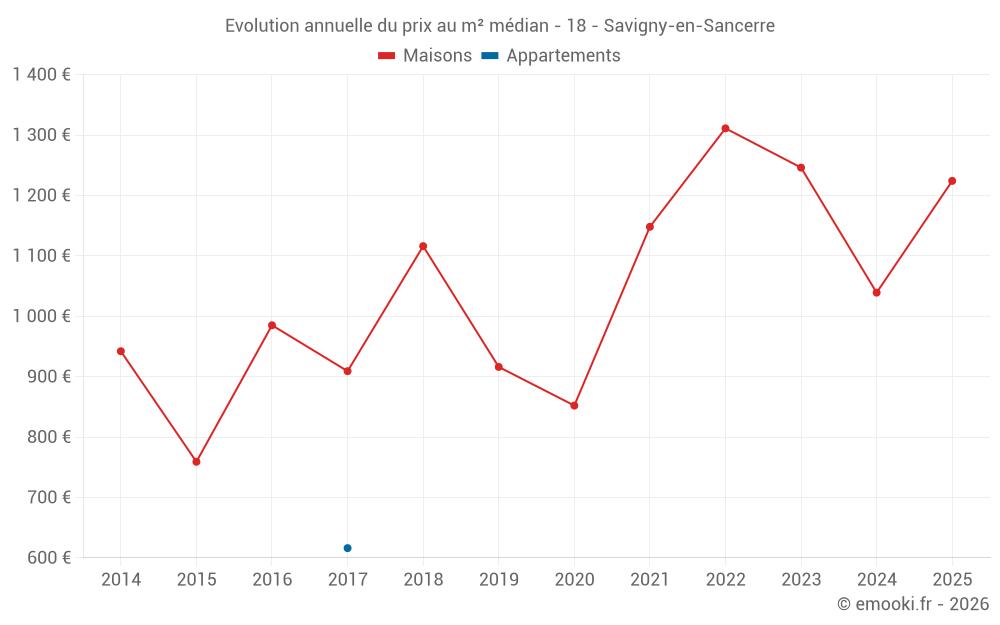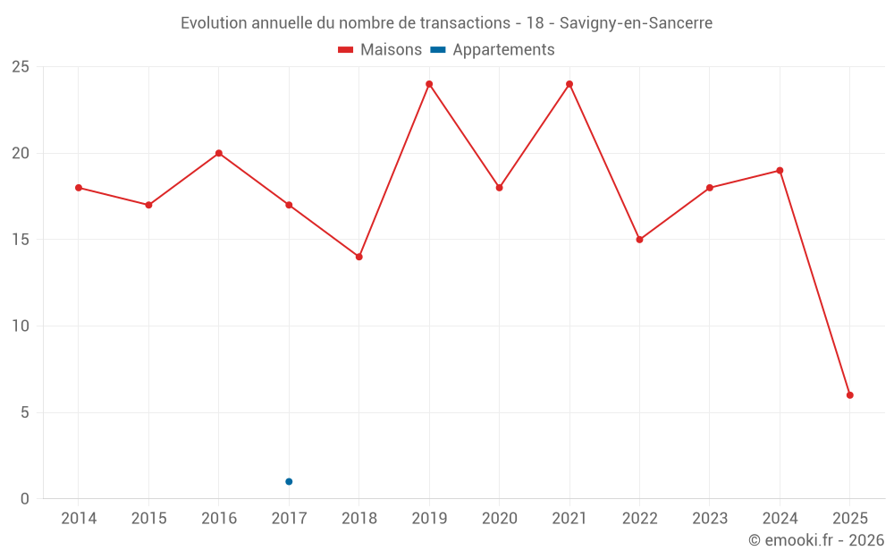 Le prix médian sur les 18 transactions de maisons des 12 derniers mois dans la commune de Savigny-en-Sancerre était de 1 431 € par mètre carré pour une valeur foncière médiane de 114 000 €. Sur cette période 60% des transactions se sont situées entre 969 et 1 789 € par mètre carré (du 2ème au 8ème déciles).