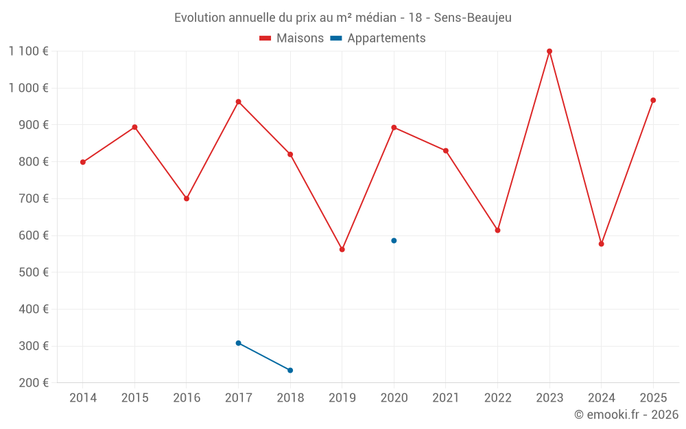 Le prix médian sur les 19 transactions de maisons des 24 derniers mois dans la commune de Sens-Beaujeu était de 967 € par mètre carré pour une valeur foncière médiane de 76 000 €. Sur cette période 60% des transactions se sont situées entre 511 et 1 407 € par mètre carré (du 2ème au 8ème déciles).