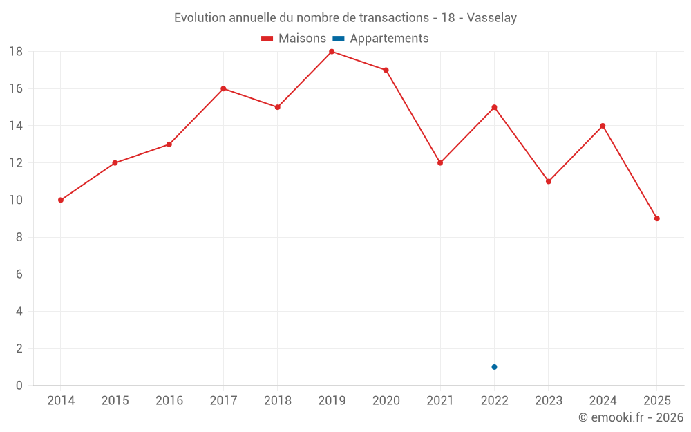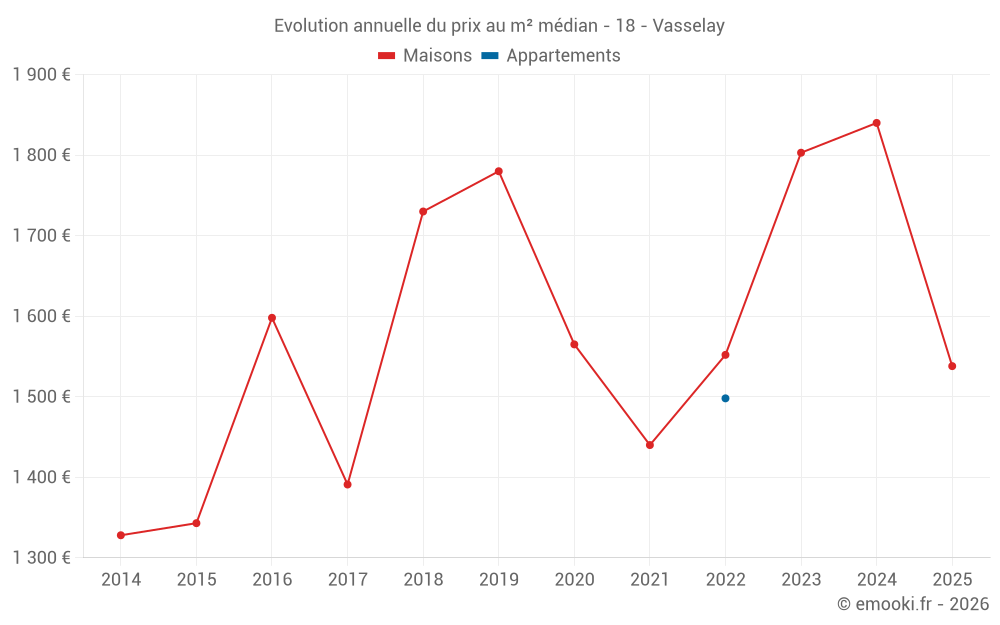 Le prix médian sur les 19 transactions de maisons des 12 derniers mois dans la commune de Vasselay était de 1 700 € par mètre carré pour une valeur foncière médiane de 185 000 €. Sur cette période 60% des transactions se sont situées entre 1 191 et 2 048 € par mètre carré (du 2ème au 8ème déciles).