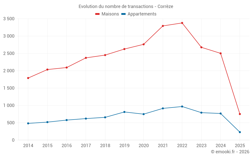 Le prix médian sur les 230 transactions d'appartements des 6 derniers mois dans le département de la Corrèze était de 1 570 € par mètre carré pour une valeur foncière médiane de 90 000 €. Sur cette période 60% des transactions se sont situées entre 870 et 2 082 € par mètre carré (du 2ème au 8ème déciles).