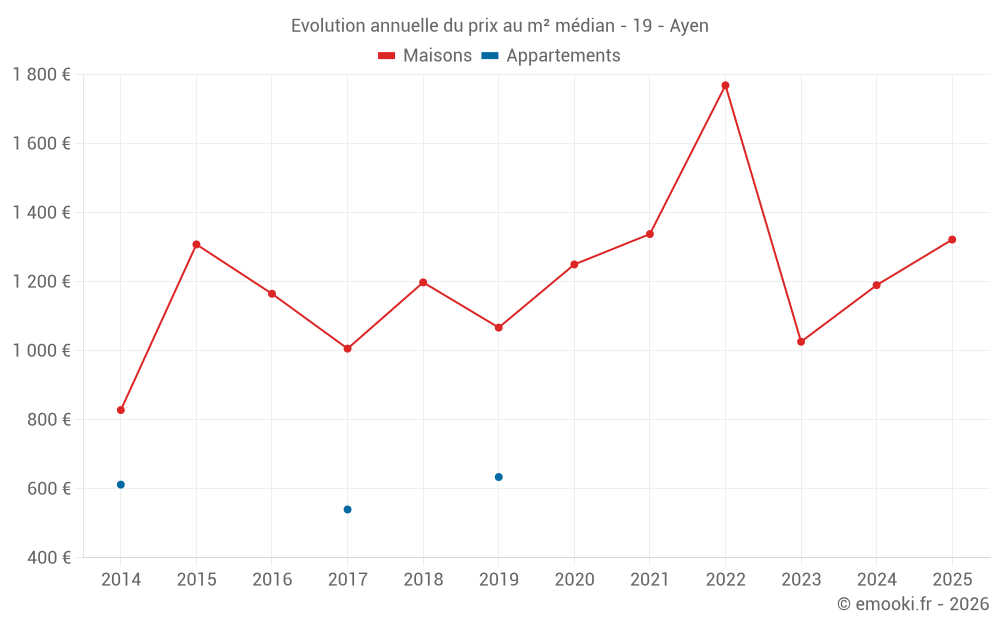 Le prix médian sur les 22 transactions de maisons des 24 derniers mois dans la commune d'Ayen était de 1 072 € par mètre carré pour une valeur foncière médiane de 91 500 €. Sur cette période 60% des transactions se sont situées entre 758 et 1 506 € par mètre carré (du 2ème au 8ème déciles).