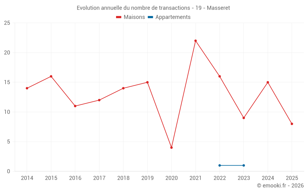Le prix médian sur les 19 transactions de maisons des 12 derniers mois dans la commune de Masseret était de 1 380 € par mètre carré pour une valeur foncière médiane de 100 000 €. Sur cette période 60% des transactions se sont situées entre 1 006 et 1 877 € par mètre carré (du 2ème au 8ème déciles).
