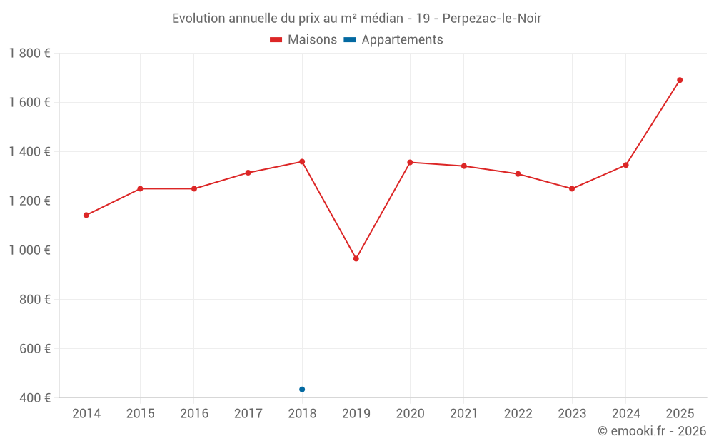 Le prix médian sur les 22 transactions de maisons des 24 derniers mois dans la commune de Perpezac-le-Noir était de 1 545 € par mètre carré pour une valeur foncière médiane de 151 150 €. Sur cette période 60% des transactions se sont situées entre 1 234 et 2 211 € par mètre carré (du 2ème au 8ème déciles).