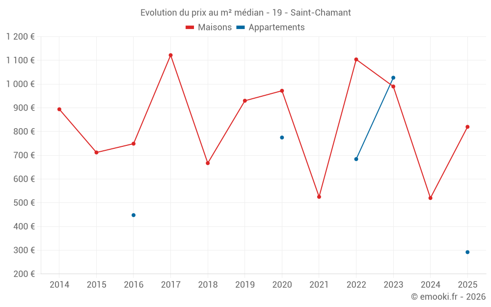 Le prix médian sur les 14 transactions de maisons des 24 derniers mois dans la commune de Saint-Chamant était de 716 € par mètre carré pour une valeur foncière médiane de 73 250 €. Sur cette période 60% des transactions se sont situées entre 499 et 1 460 € par mètre carré (du 2ème au 8ème déciles).