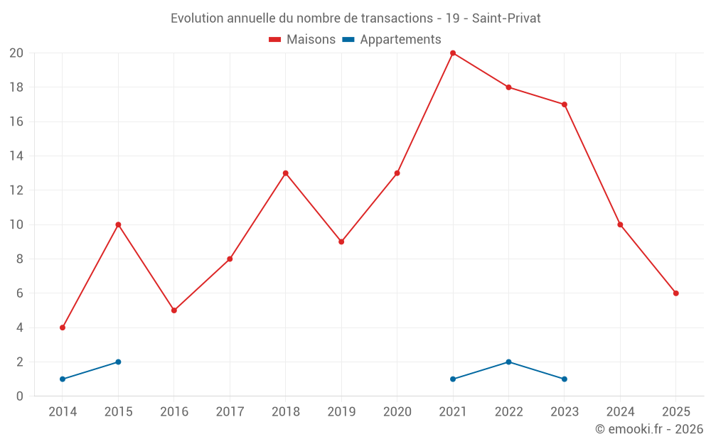 Le prix médian sur les 26 transactions de maisons des 24 derniers mois dans la commune de Saint-Privat était de 1 089 € par mètre carré pour une valeur foncière médiane de 98 275 €. Sur cette période 60% des transactions se sont situées entre 817 et 1 573 € par mètre carré (du 2ème au 8ème déciles).