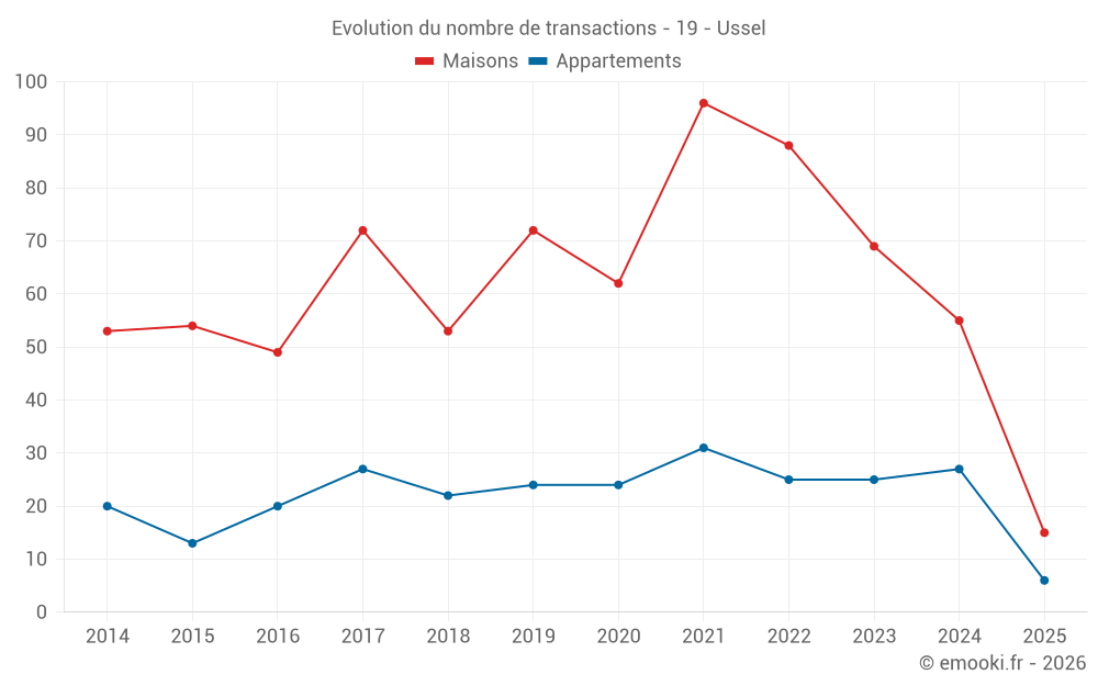 Le prix médian sur les 21 transactions d'appartements des 12 derniers mois dans la commune d'Ussel était de 831 € par mètre carré pour une valeur foncière médiane de 54 000 €. Sur cette période 60% des transactions se sont situées entre 529 et 1 053 € par mètre carré (du 2ème au 8ème déciles).