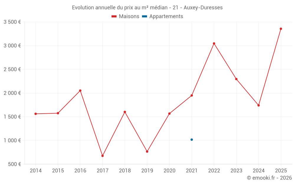 Le prix médian sur les 18 transactions de maisons des 24 derniers mois dans la commune d'Auxey-Duresses était de 2 241 € par mètre carré pour une valeur foncière médiane de 223 150 €. Sur cette période 60% des transactions se sont situées entre 1 033 et 2 880 € par mètre carré (du 2ème au 8ème déciles).