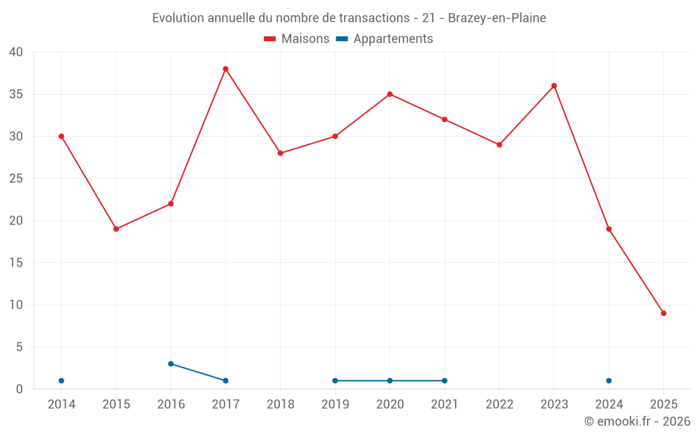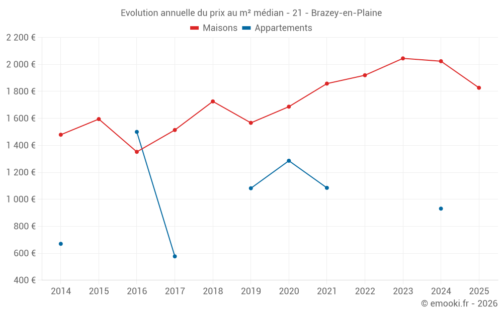 Le prix médian sur les 20 transactions de maisons des 12 derniers mois dans la commune de Brazey-en-Plaine était de 1 980 € par mètre carré pour une valeur foncière médiane de 189 250 €. Sur cette période 60% des transactions se sont situées entre 1 604 et 2 170 € par mètre carré (du 2ème au 8ème déciles).