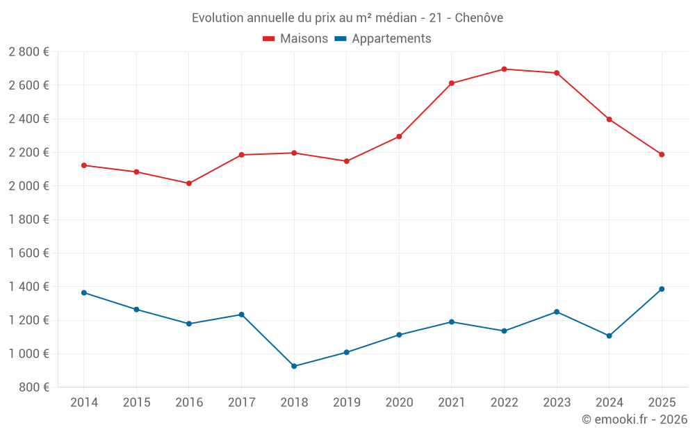 Le prix médian sur les 24 transactions de maisons des 12 derniers mois dans la commune de Chenôve était de 2 686 € par mètre carré pour une valeur foncière médiane de 199 305 €. Sur cette période 60% des transactions se sont situées entre 2 108 et 3 023 € par mètre carré (du 2ème au 8ème déciles).
