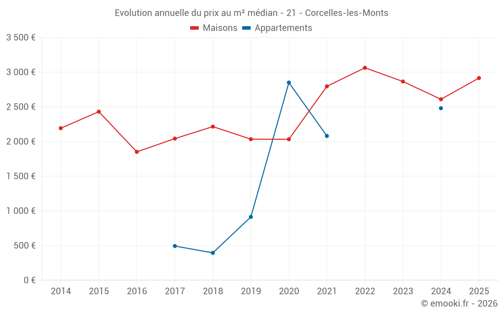 Le prix médian sur les 17 transactions de maisons des 24 derniers mois dans la commune de Corcelles-les-Monts était de 2 915 € par mètre carré pour une valeur foncière médiane de 283 000 €. Sur cette période 60% des transactions se sont situées entre 2 345 et 3 362 € par mètre carré (du 2ème au 8ème déciles).