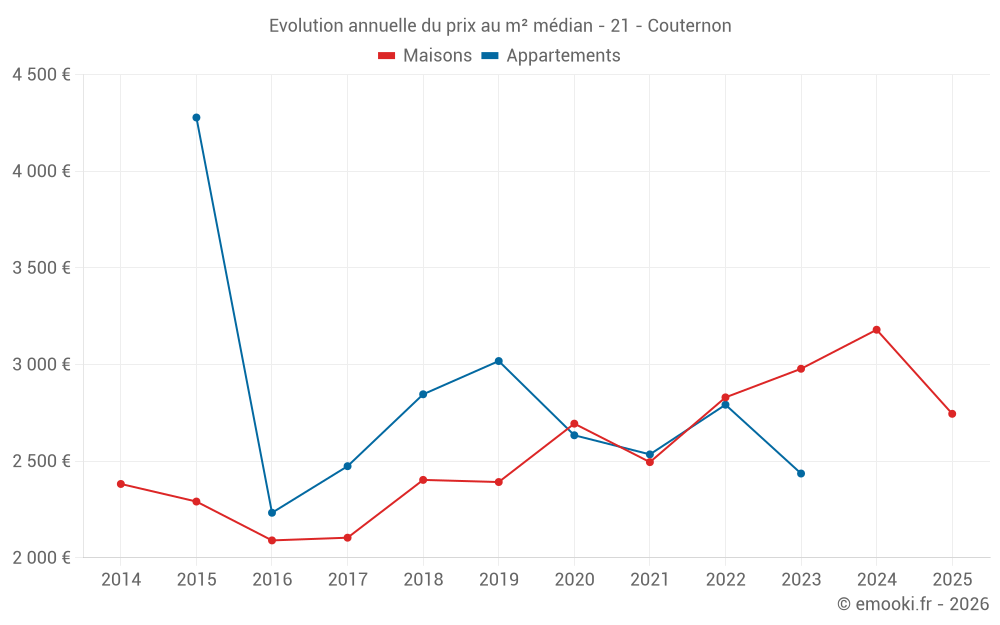 Le prix médian sur les 19 transactions de maisons des 24 derniers mois dans la commune de Couternon était de 2 962 € par mètre carré pour une valeur foncière médiane de 300 000 €. Sur cette période 60% des transactions se sont situées entre 2 401 et 3 684 € par mètre carré (du 2ème au 8ème déciles).