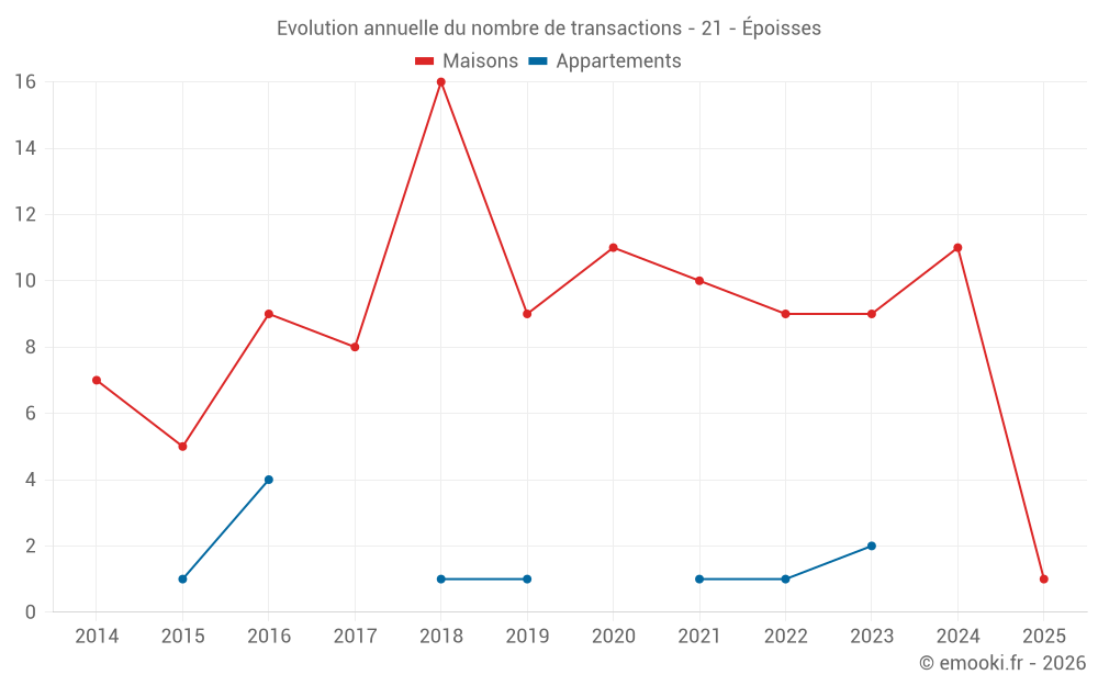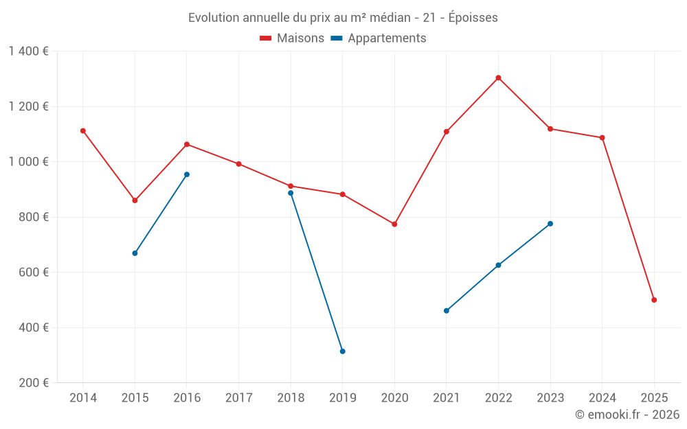Le prix médian sur les 17 transactions de maisons des 24 derniers mois dans la commune d'Époisses était de 1 087 € par mètre carré pour une valeur foncière médiane de 121 600 €. Sur cette période 60% des transactions se sont situées entre 779 et 1 694 € par mètre carré (du 2ème au 8ème déciles).