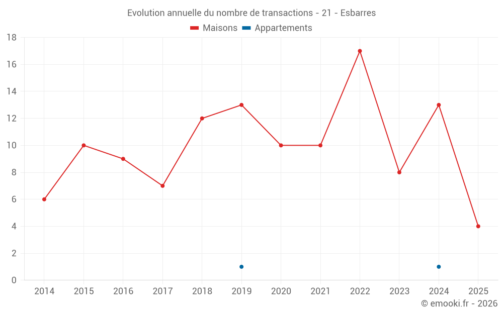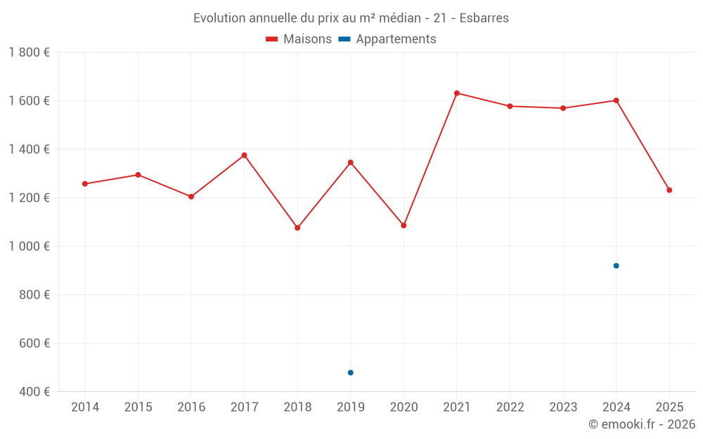 Le prix médian sur les 21 transactions de maisons des 24 derniers mois dans la commune d'Esbarres était de 1 552 € par mètre carré pour une valeur foncière médiane de 166 500 €. Sur cette période 60% des transactions se sont situées entre 1 167 et 2 130 € par mètre carré (du 2ème au 8ème déciles).
