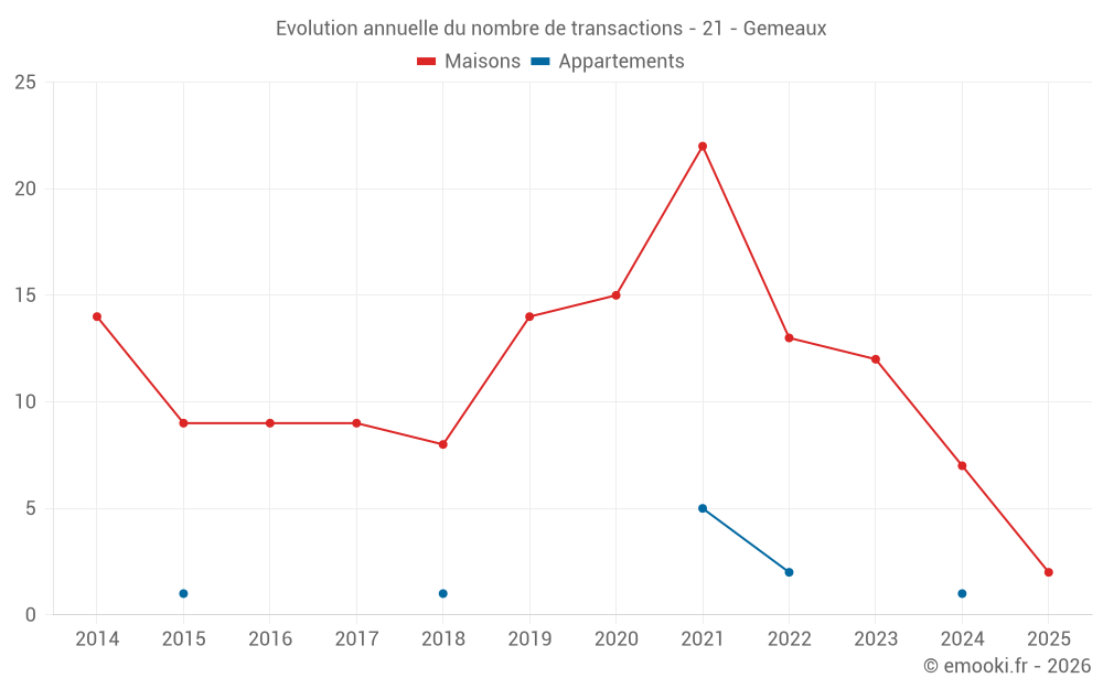 Le prix médian sur les 15 transactions de maisons des 24 derniers mois dans la commune de Gemeaux était de 1 828 € par mètre carré pour une valeur foncière médiane de 160 000 €. Sur cette période 60% des transactions se sont situées entre 1 382 et 2 854 € par mètre carré (du 2ème au 8ème déciles).