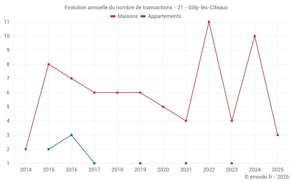 Le prix médian sur les 14 transactions de maisons des 24 derniers mois dans la commune de Gilly-lès-Cîteaux était de 2 656 € par mètre carré pour une valeur foncière médiane de 305 510 €. Sur cette période 60% des transactions se sont situées entre 2 457 et 2 856 € par mètre carré (du 2ème au 8ème déciles).