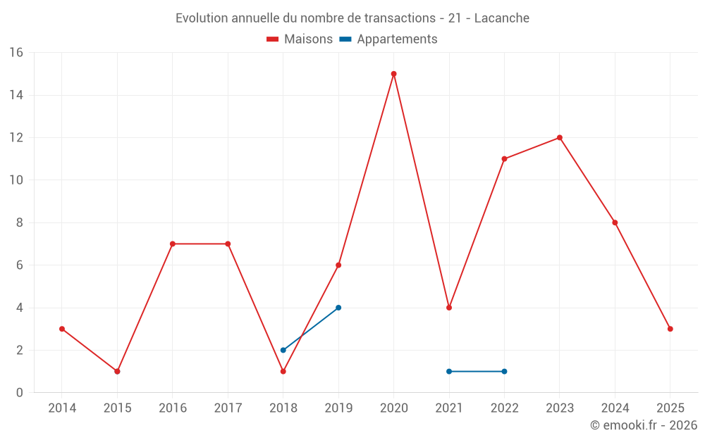 Le prix médian sur les 19 transactions de maisons des 24 derniers mois dans la commune de Lacanche était de 909 € par mètre carré pour une valeur foncière médiane de 89 000 €. Sur cette période 60% des transactions se sont situées entre 586 et 1 360 € par mètre carré (du 2ème au 8ème déciles).