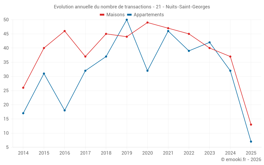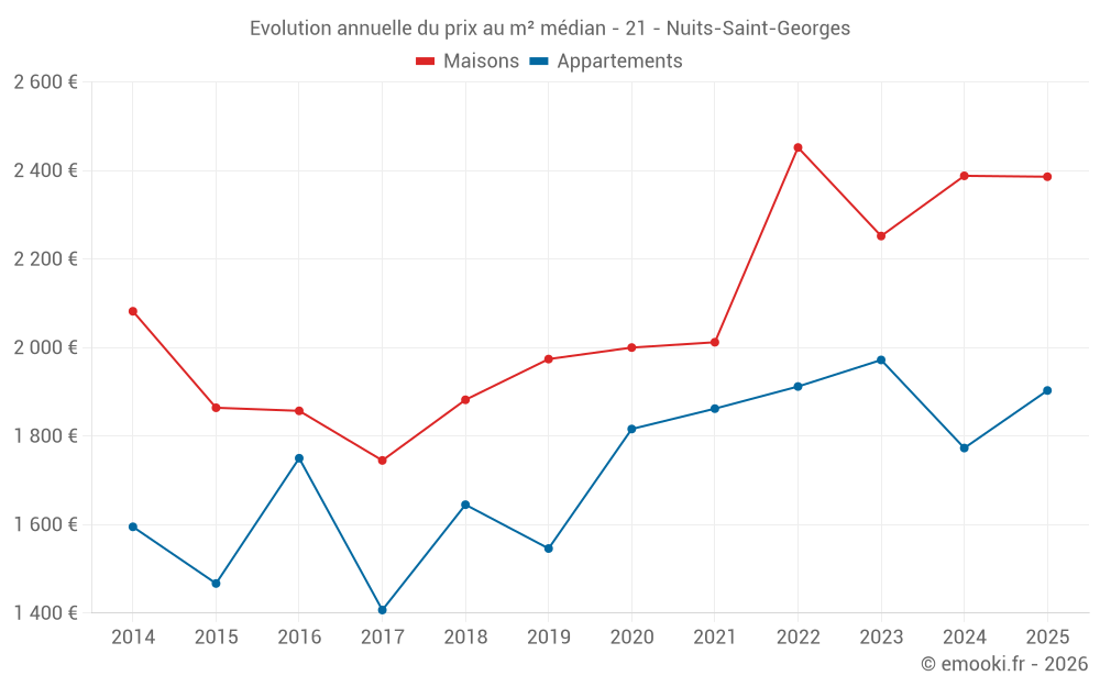 Le prix médian sur les 36 transactions de maisons des 12 derniers mois dans la commune de Nuits-Saint-Georges était de 2 360 € par mètre carré pour une valeur foncière médiane de 230 000 €. Sur cette période 60% des transactions se sont situées entre 1 500 et 2 741 € par mètre carré (du 2ème au 8ème déciles).