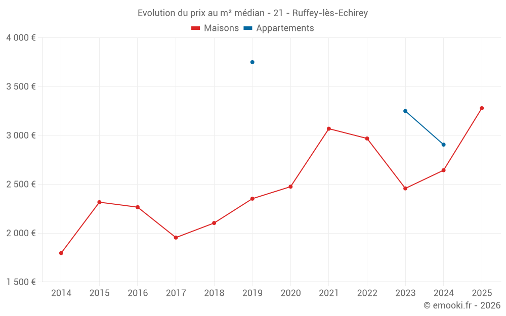 Le prix médian sur les 15 transactions de maisons des 24 derniers mois dans la commune de Ruffey-lès-Echirey était de 2 617 € par mètre carré pour une valeur foncière médiane de 280 000 €. Sur cette période 60% des transactions se sont situées entre 1 826 et 3 346 € par mètre carré (du 2ème au 8ème déciles).