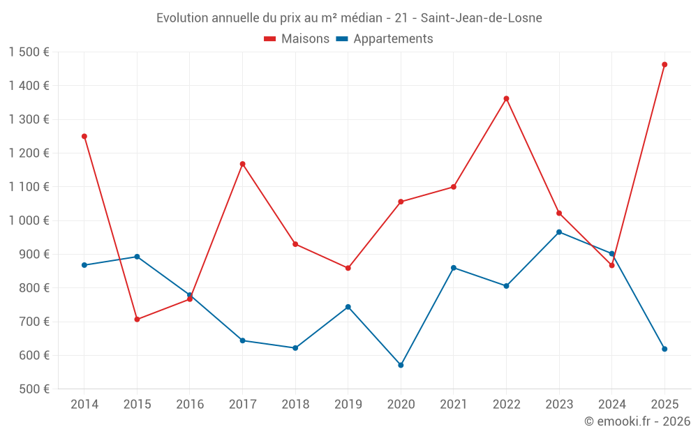 Le prix médian sur les 32 transactions d'appartements des 24 derniers mois dans la commune de Saint-Jean-de-Losne était de 842 € par mètre carré pour une valeur foncière médiane de 59 250 €. Sur cette période 60% des transactions se sont situées entre 625 et 1 179 € par mètre carré (du 2ème au 8ème déciles).