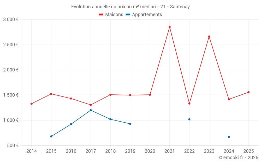 Le prix médian sur les 17 transactions de maisons des 24 derniers mois dans la commune de Santenay était de 1 661 € par mètre carré pour une valeur foncière médiane de 140 000 €. Sur cette période 60% des transactions se sont situées entre 1 106 et 2 237 € par mètre carré (du 2ème au 8ème déciles).