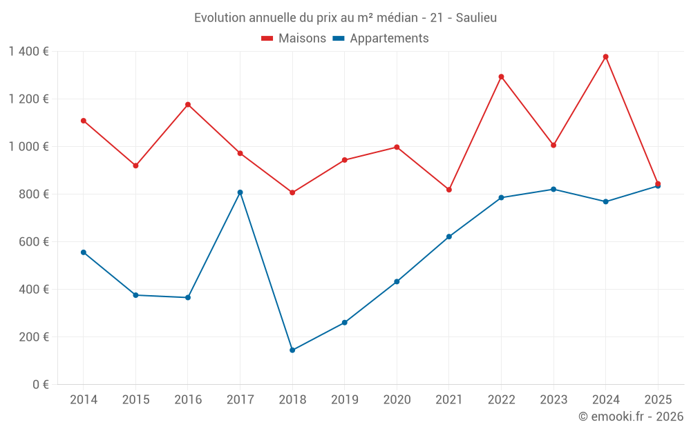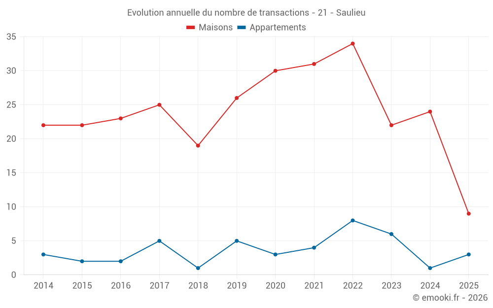 Le prix médian sur les 21 transactions de maisons des 12 derniers mois dans la commune de Saulieu était de 1 176 € par mètre carré pour une valeur foncière médiane de 100 000 €. Sur cette période 60% des transactions se sont situées entre 733 et 1 585 € par mètre carré (du 2ème au 8ème déciles).
