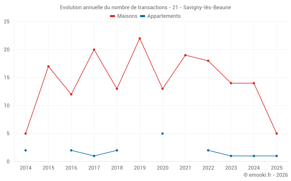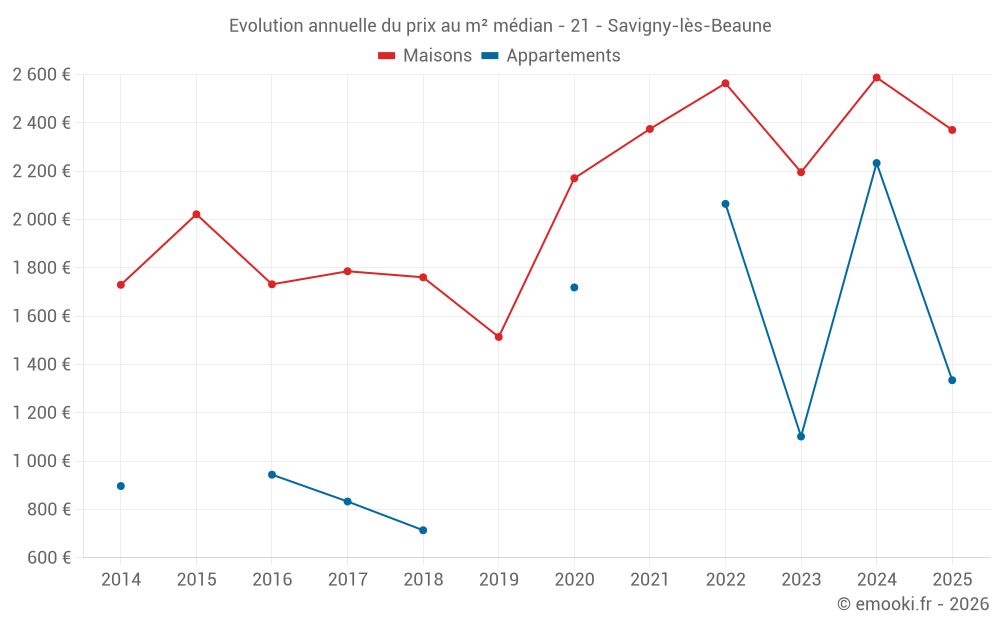 Le prix médian sur les 25 transactions de maisons des 24 derniers mois dans la commune de Savigny-lès-Beaune était de 2 454 € par mètre carré pour une valeur foncière médiane de 257 200 €. Sur cette période 60% des transactions se sont situées entre 1 817 et 3 032 € par mètre carré (du 2ème au 8ème déciles).