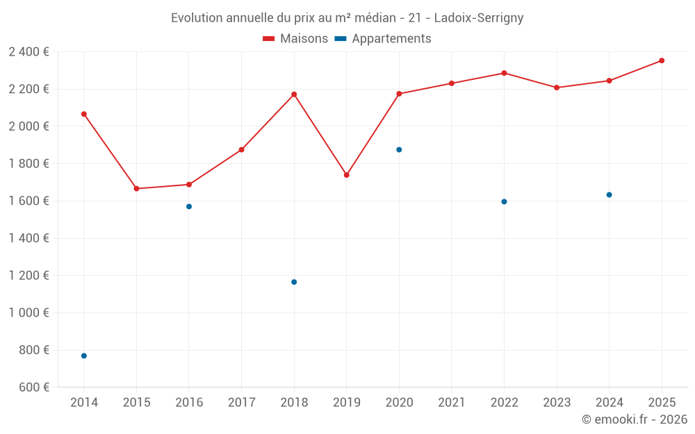 Le prix médian sur les 33 transactions de maisons des 24 derniers mois dans la commune de Ladoix-Serrigny était de 2 241 € par mètre carré pour une valeur foncière médiane de 230 600 €. Sur cette période 60% des transactions se sont situées entre 1 600 et 3 272 € par mètre carré (du 2ème au 8ème déciles).