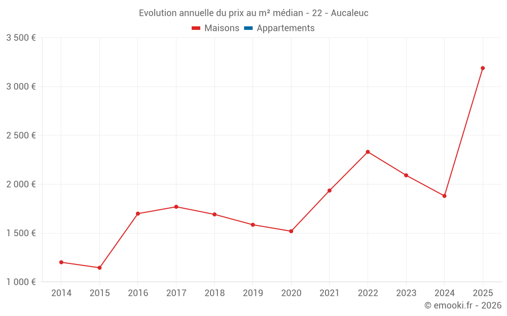 Le prix médian sur les 14 transactions de maisons des 24 derniers mois dans la commune d'Aucaleuc était de 2 384 € par mètre carré pour une valeur foncière médiane de 223 000 €. Sur cette période 60% des transactions se sont situées entre 1 732 et 2 558 € par mètre carré (du 2ème au 8ème déciles).