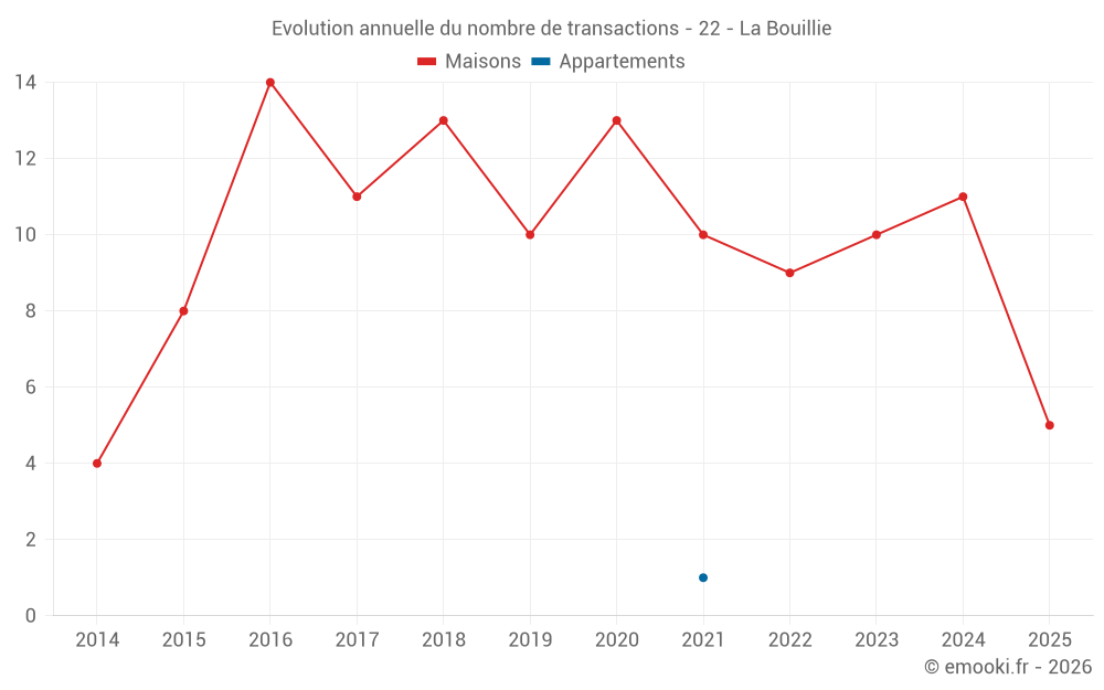Le prix médian sur les 20 transactions de maisons des 24 derniers mois dans la commune de la Bouillie était de 2 303 € par mètre carré pour une valeur foncière médiane de 196 040 €. Sur cette période 60% des transactions se sont situées entre 1 938 et 2 732 € par mètre carré (du 2ème au 8ème déciles).