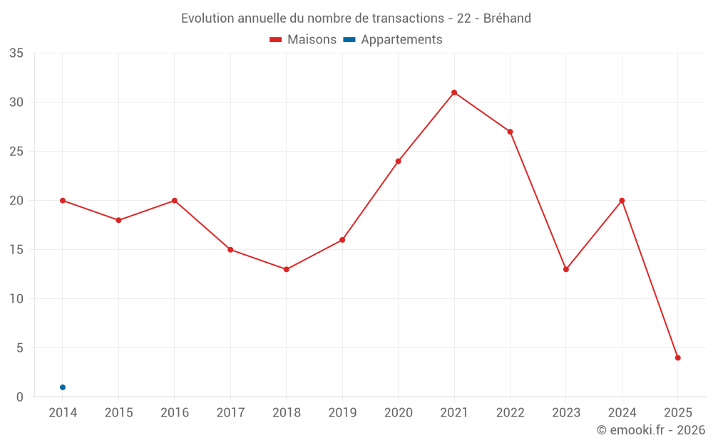 Le prix médian sur les 30 transactions de maisons des 24 derniers mois dans la commune de Bréhand était de 1 644 € par mètre carré pour une valeur foncière médiane de 157 500 €. Sur cette période 60% des transactions se sont situées entre 1 066 et 2 004 € par mètre carré (du 2ème au 8ème déciles).