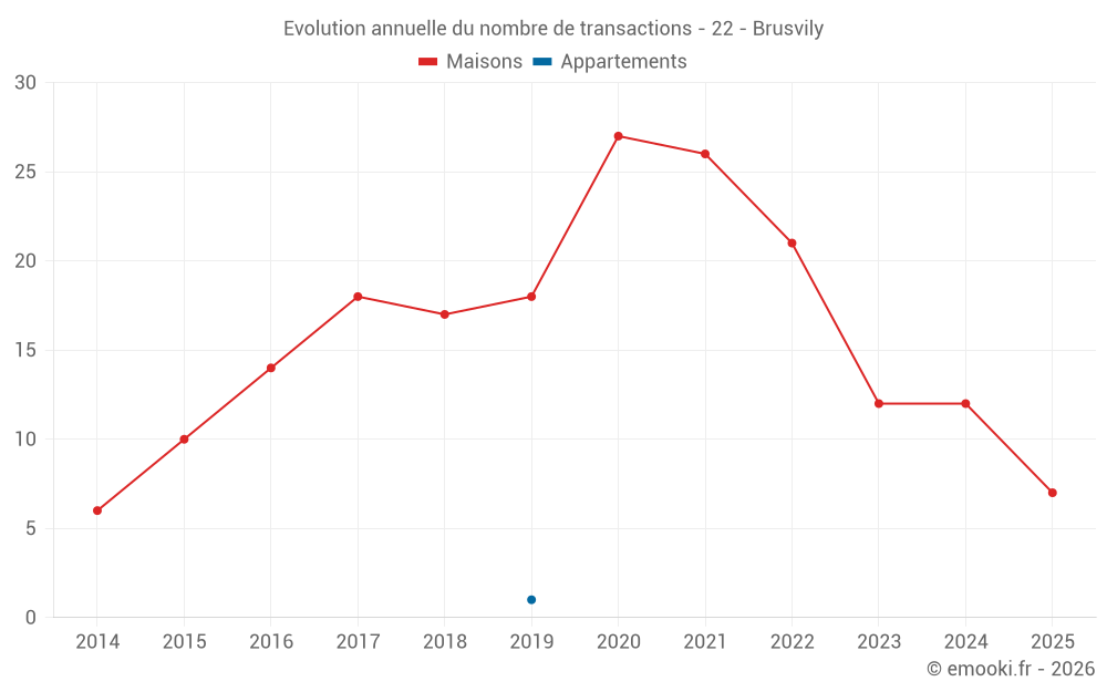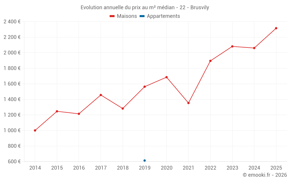 Le prix médian sur les 26 transactions de maisons des 24 derniers mois dans la commune de Brusvily était de 1 948 € par mètre carré pour une valeur foncière médiane de 187 850 €. Sur cette période 60% des transactions se sont situées entre 1 438 et 2 317 € par mètre carré (du 2ème au 8ème déciles).