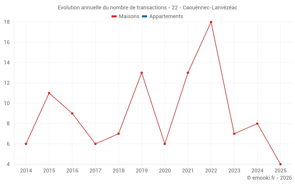 Le prix médian sur les 16 transactions de maisons des 24 derniers mois dans la commune de Caouënnec-Lanvézéac était de 1 938 € par mètre carré pour une valeur foncière médiane de 220 225 €. Sur cette période 60% des transactions se sont situées entre 1 318 et 2 192 € par mètre carré (du 2ème au 8ème déciles).