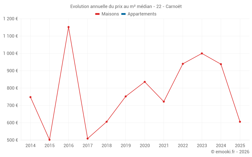 Le prix médian sur les 16 transactions de maisons des 12 derniers mois dans la commune de Carnoët était de 1 000 € par mètre carré pour une valeur foncière médiane de 53 500 €. Sur cette période 60% des transactions se sont situées entre 373 et 1 285 € par mètre carré (du 2ème au 8ème déciles).