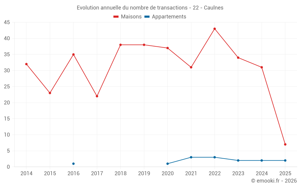 Le prix médian sur les 22 transactions de maisons des 12 derniers mois dans la commune de Caulnes était de 1 575 € par mètre carré pour une valeur foncière médiane de 166 500 €. Sur cette période 60% des transactions se sont situées entre 934 et 2 278 € par mètre carré (du 2ème au 8ème déciles).
