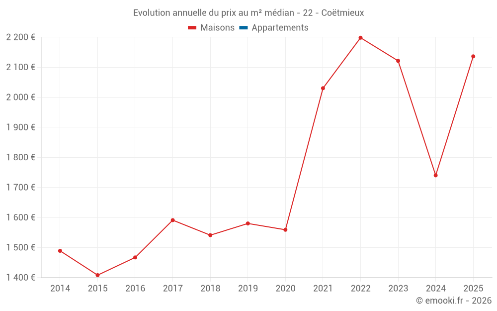 Le prix médian sur les 23 transactions de maisons des 24 derniers mois dans la commune de Coëtmieux était de 2 075 € par mètre carré pour une valeur foncière médiane de 180 000 €. Sur cette période 60% des transactions se sont situées entre 1 603 et 2 435 € par mètre carré (du 2ème au 8ème déciles).