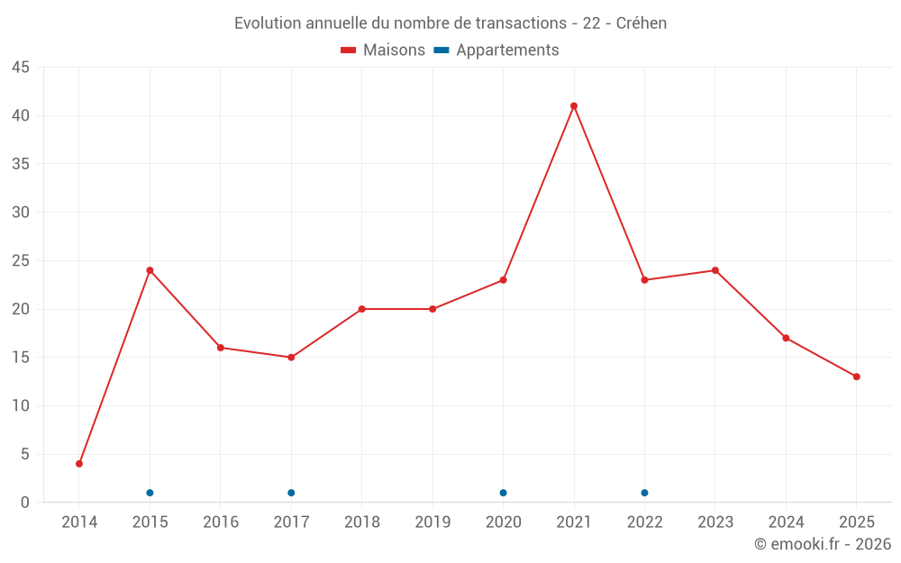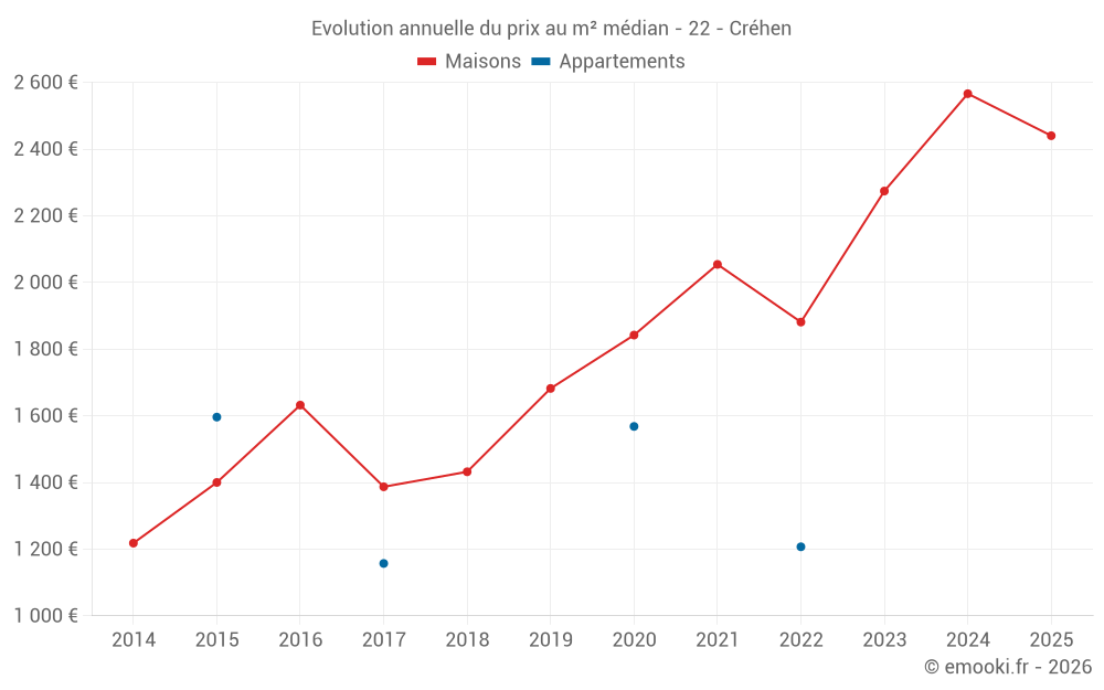 Le prix médian sur les 22 transactions de maisons des 12 derniers mois dans la commune de Créhen était de 2 456 € par mètre carré pour une valeur foncière médiane de 235 000 €. Sur cette période 60% des transactions se sont situées entre 1 869 et 2 784 € par mètre carré (du 2ème au 8ème déciles).