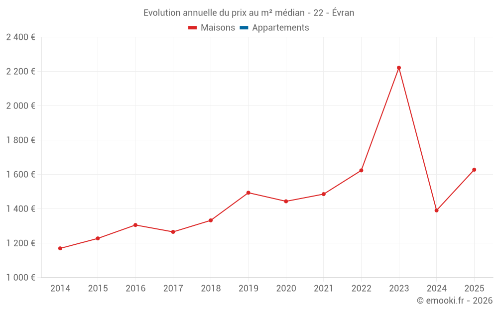 Le prix médian sur les 37 transactions de maisons des 24 derniers mois dans la commune d'Évran était de 1 600 € par mètre carré pour une valeur foncière médiane de 188 400 €. Sur cette période 60% des transactions se sont situées entre 1 099 et 2 388 € par mètre carré (du 2ème au 8ème déciles).