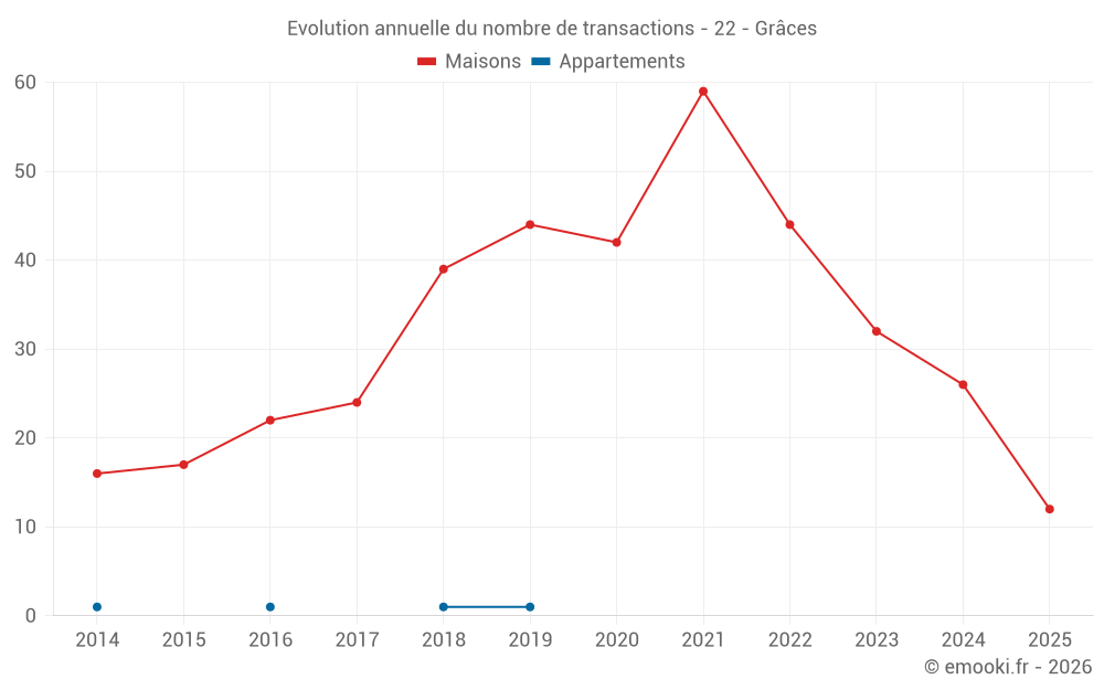 Le prix médian sur les 28 transactions de maisons des 12 derniers mois dans la commune de Grâces était de 1 728 € par mètre carré pour une valeur foncière médiane de 156 500 €. Sur cette période 60% des transactions se sont situées entre 1 286 et 2 271 € par mètre carré (du 2ème au 8ème déciles).