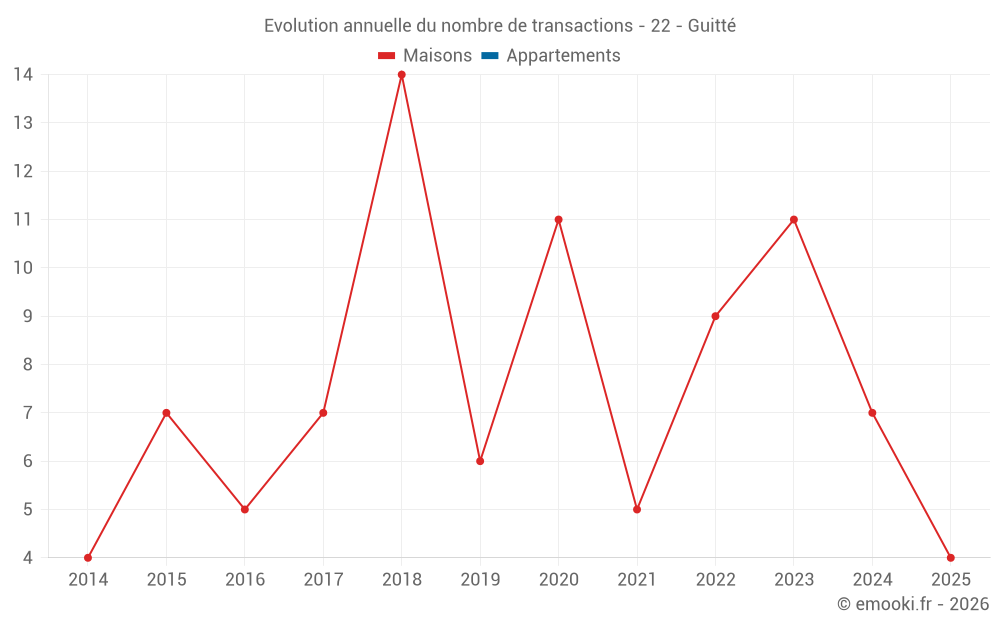 Le prix médian sur les 14 transactions de maisons des 24 derniers mois dans la commune de Guitté était de 1 905 € par mètre carré pour une valeur foncière médiane de 150 000 €. Sur cette période 60% des transactions se sont situées entre 1 180 et 2 157 € par mètre carré (du 2ème au 8ème déciles).