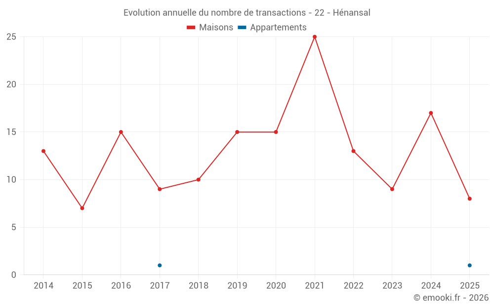 Le prix médian sur les 17 transactions de maisons des 12 derniers mois dans la commune de Hénansal était de 1 667 € par mètre carré pour une valeur foncière médiane de 200 000 €. Sur cette période 60% des transactions se sont situées entre 1 215 et 2 410 € par mètre carré (du 2ème au 8ème déciles).