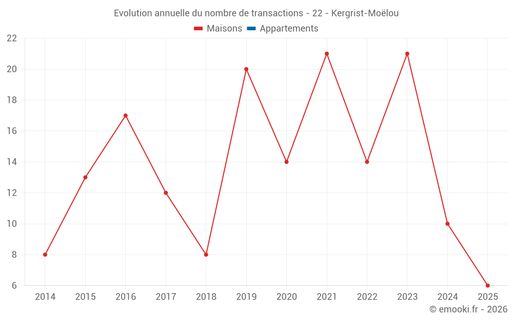 Le prix médian sur les 24 transactions de maisons des 24 derniers mois dans la commune de Kergrist-Moëlou était de 854 € par mètre carré pour une valeur foncière médiane de 81 000 €. Sur cette période 60% des transactions se sont situées entre 655 et 1 499 € par mètre carré (du 2ème au 8ème déciles).