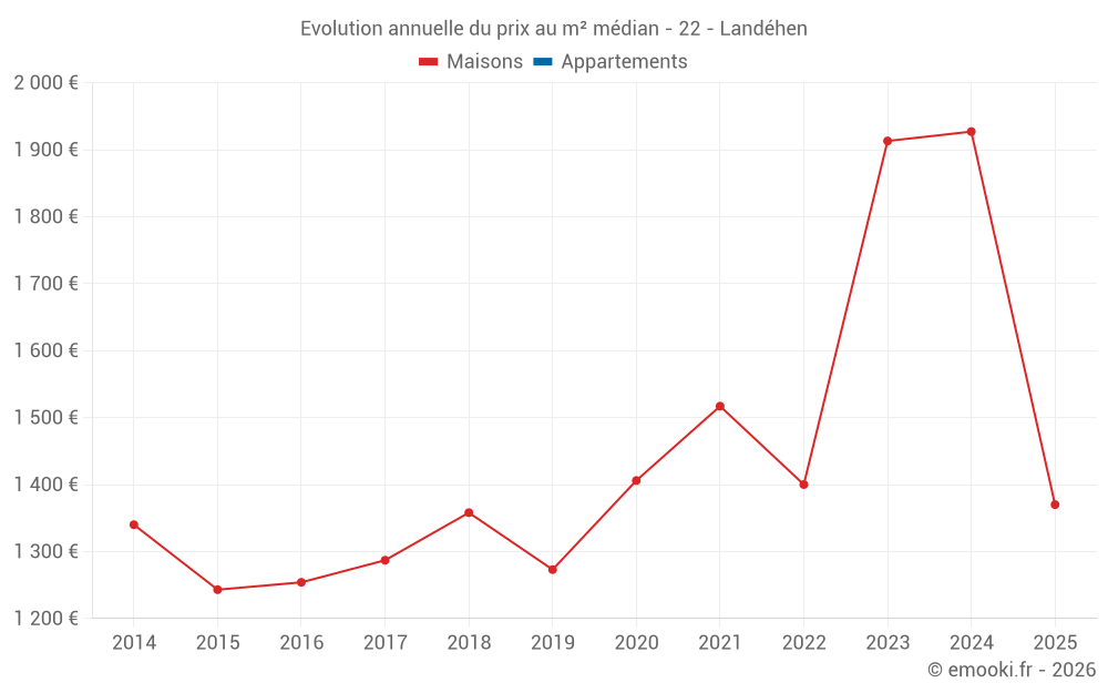 Le prix médian sur les 23 transactions de maisons des 24 derniers mois dans la commune de Landéhen était de 1 932 € par mètre carré pour une valeur foncière médiane de 205 660 €. Sur cette période 60% des transactions se sont situées entre 1 624 et 2 357 € par mètre carré (du 2ème au 8ème déciles).