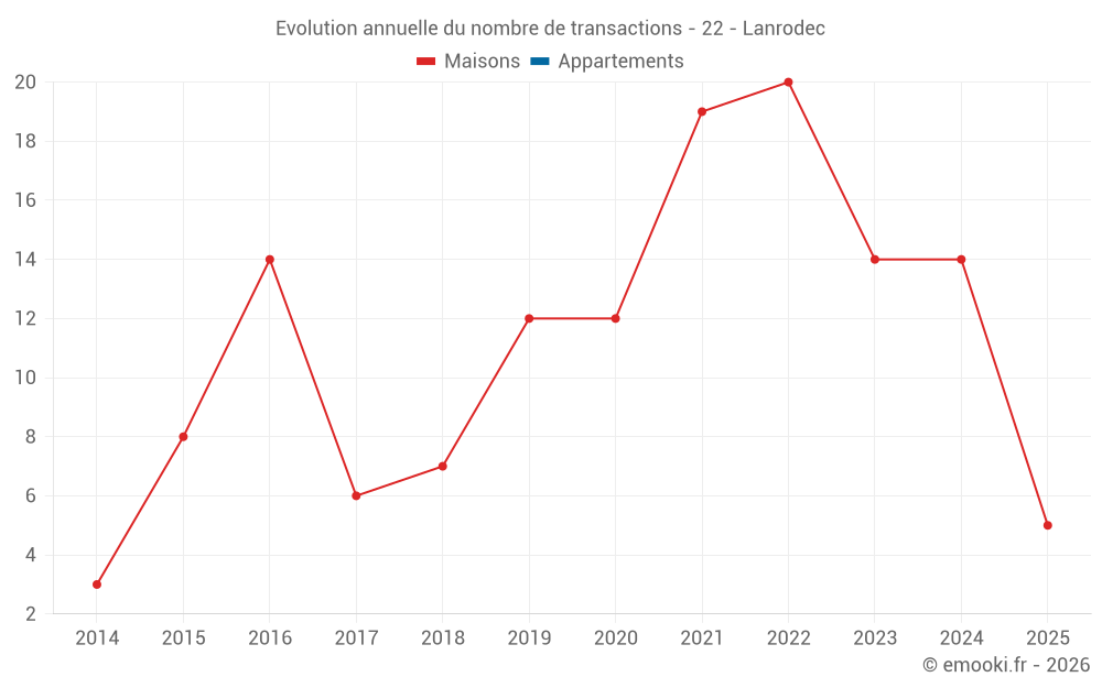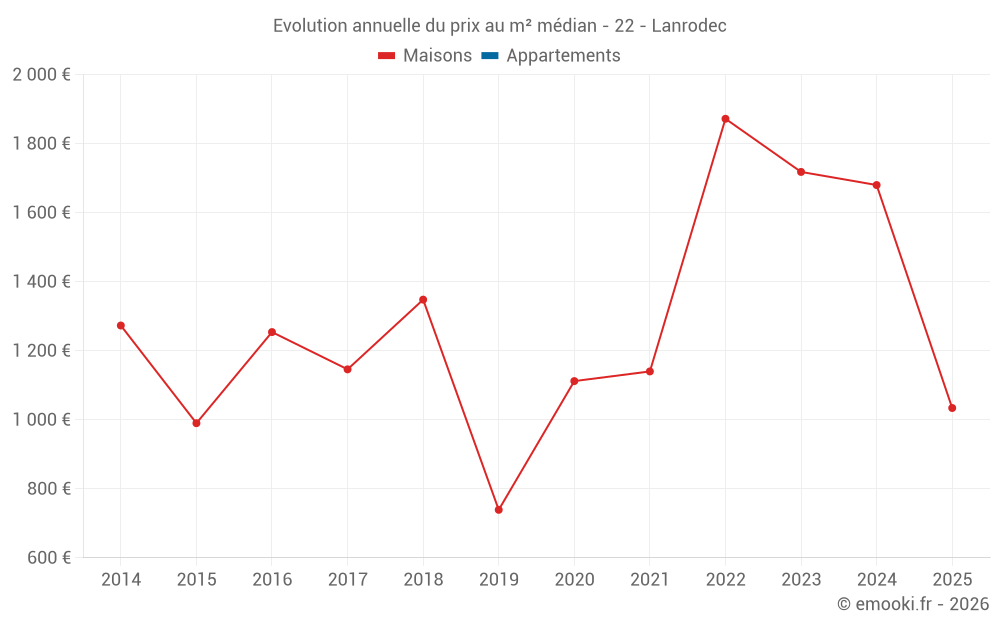 Le prix médian sur les 24 transactions de maisons des 24 derniers mois dans la commune de Lanrodec était de 1 425 € par mètre carré pour une valeur foncière médiane de 145 000 €. Sur cette période 60% des transactions se sont situées entre 1 041 et 2 229 € par mètre carré (du 2ème au 8ème déciles).