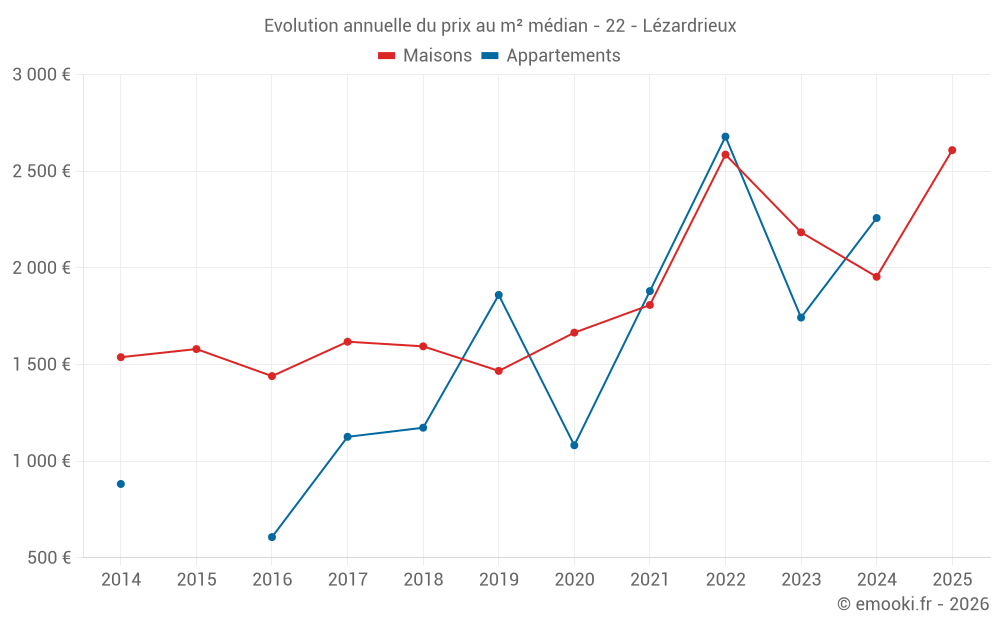 Le prix médian sur les 26 transactions de maisons des 12 derniers mois dans la commune de Lézardrieux était de 2 288 € par mètre carré pour une valeur foncière médiane de 235 925 €. Sur cette période 60% des transactions se sont situées entre 1 667 et 3 939 € par mètre carré (du 2ème au 8ème déciles).