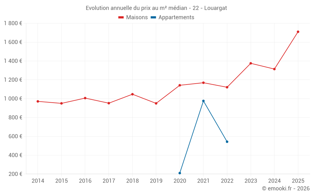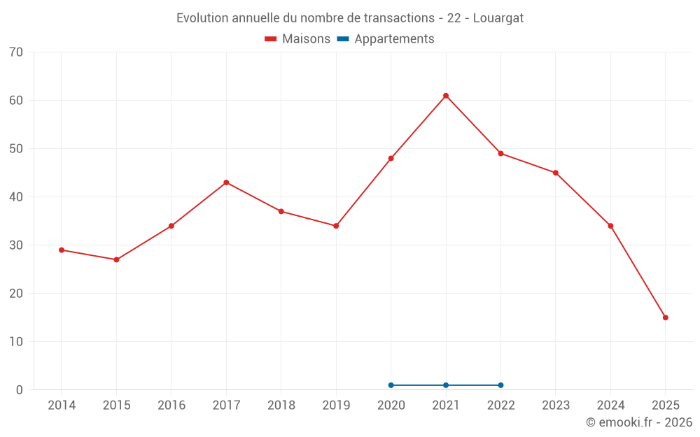 Le prix médian sur les 38 transactions de maisons des 12 derniers mois dans la commune de Louargat était de 1 516 € par mètre carré pour une valeur foncière médiane de 144 000 €. Sur cette période 60% des transactions se sont situées entre 817 et 2 336 € par mètre carré (du 2ème au 8ème déciles).