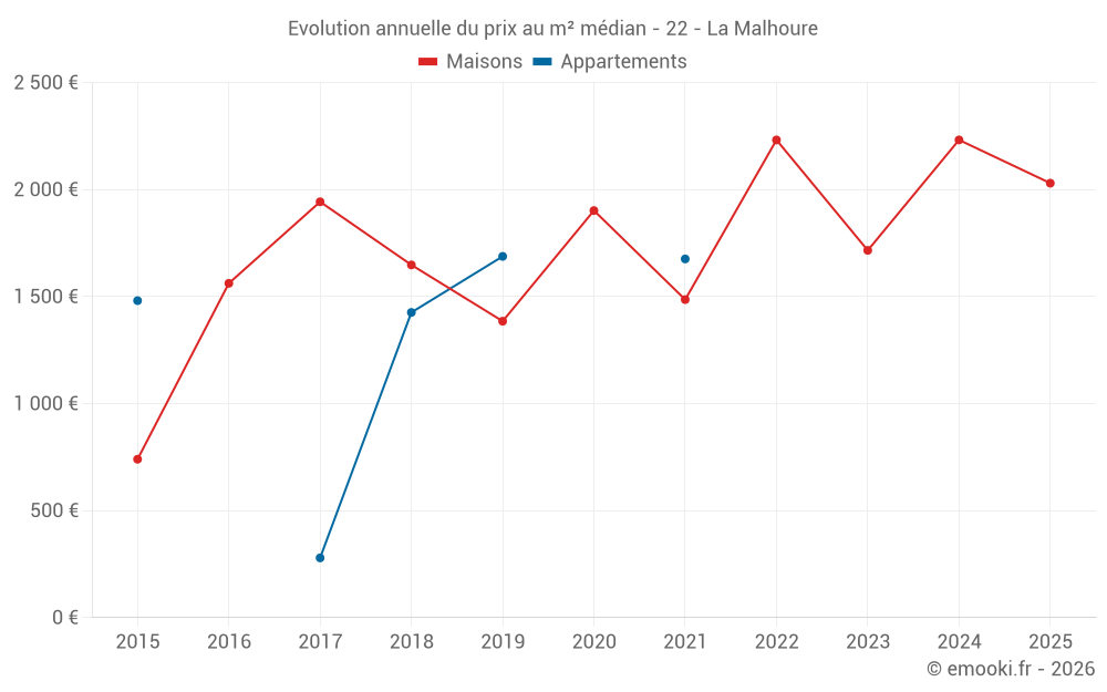 Le prix médian sur les 15 transactions de maisons des 24 derniers mois dans la commune de la Malhoure était de 2 065 € par mètre carré pour une valeur foncière médiane de 190 000 €. Sur cette période 60% des transactions se sont situées entre 1 757 et 2 335 € par mètre carré (du 2ème au 8ème déciles).